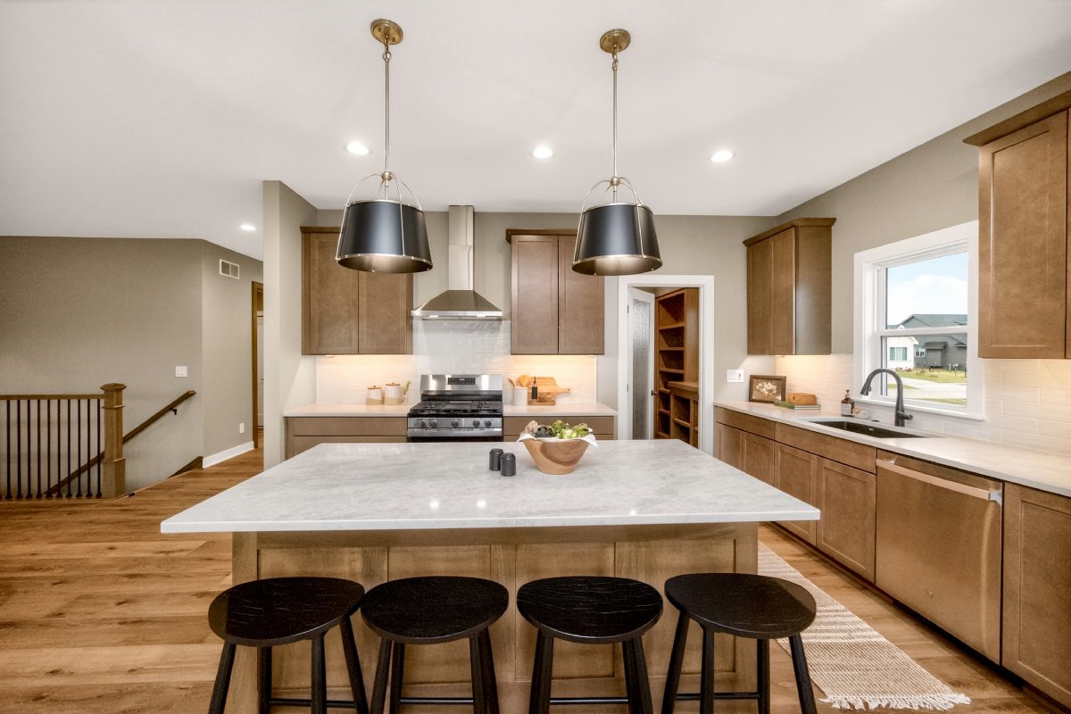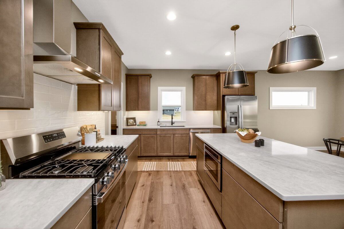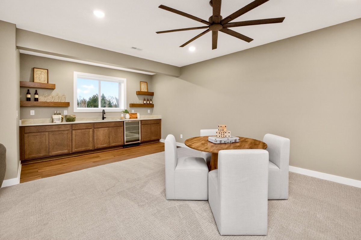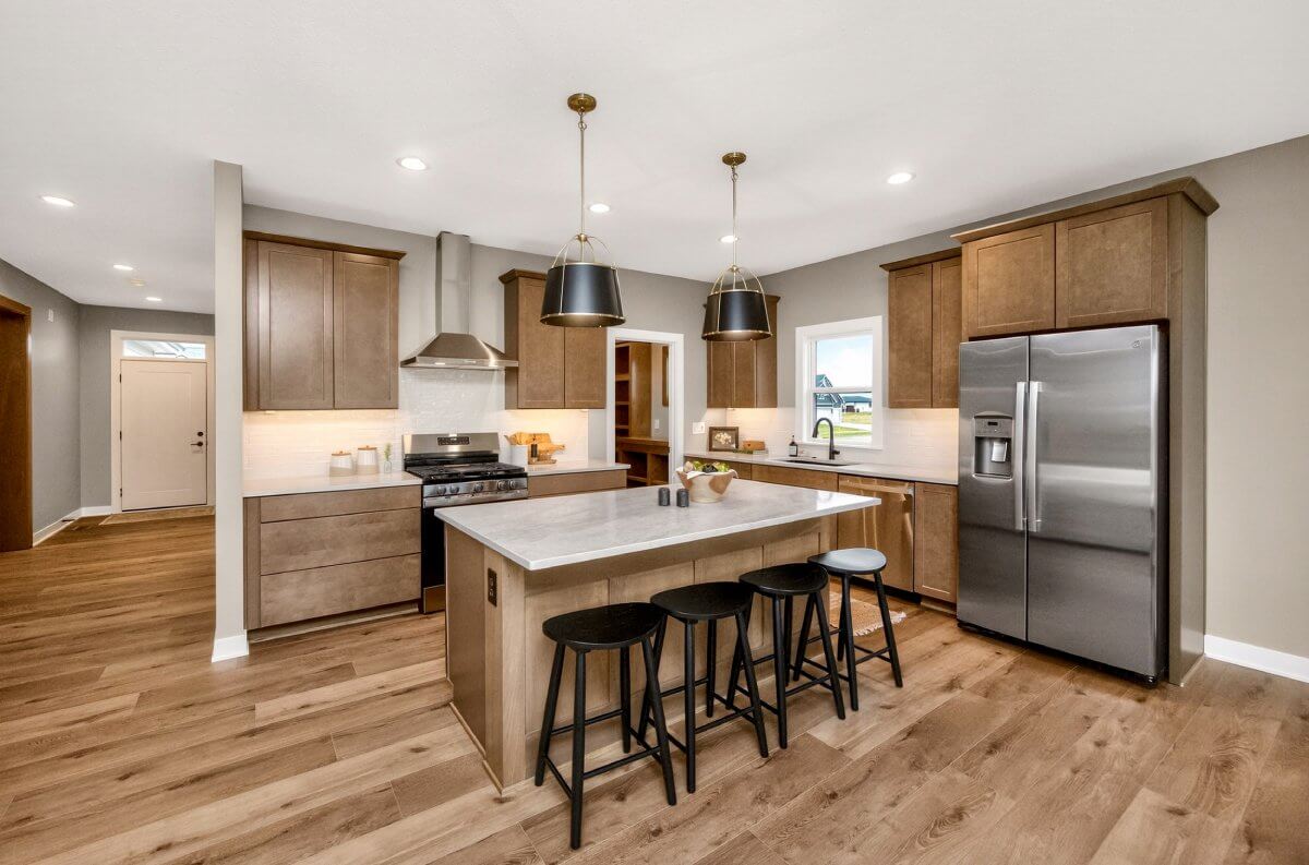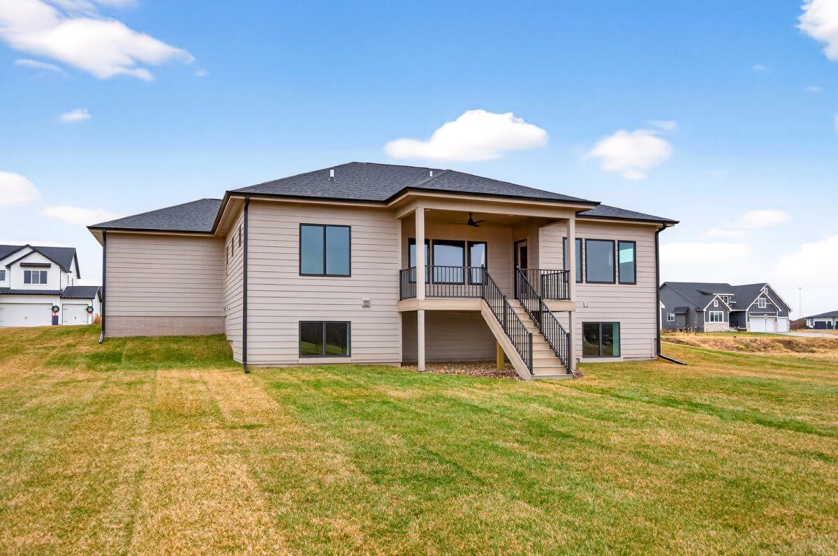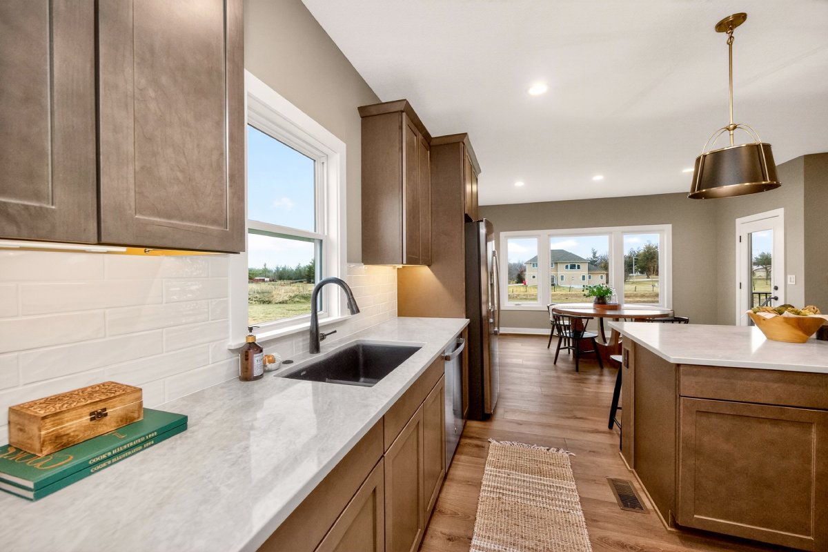 VanDerKamp Home Builders’ Stillwater Ranch Plan features 5 bedrooms (3 main level, 2 lower level) and an open floor plan featuring a maintenance-free covered deck, great room with custom built-ins, floating shelves and electric fireplace, laundry room with folding counter and sink off garage entry with access to primary bedroom, closet with custom built-ins and bathroom with tiled shower, double vanity and separate toilet room. Gorgeous mocha stained cabinets in the kitchen and walk-in pantry with custom built-in shelving and coffee/beverage station. Check out the cool kitchen island countertop with the built-in and convenient mobile charging station! Lower level family room with daylight windows, wet bar, adorable reading nook with drawers, full bathroom, and 2 bedrooms. Amazing 1,152 SF 3 car garage with 16′ X 36′ third stall, 2 floor drains, gas heater, epoxied floor, roll-up door off back of third stall leading to covered patio. Additional features include a passive radon system for piece of mind and a sodded lot with irrigation. This home is perfect for entertaining and gathering with family and friends!