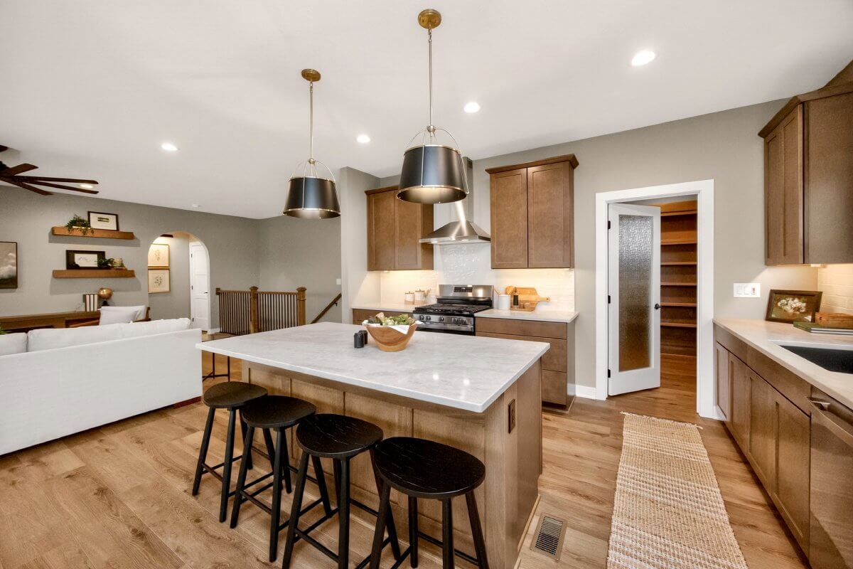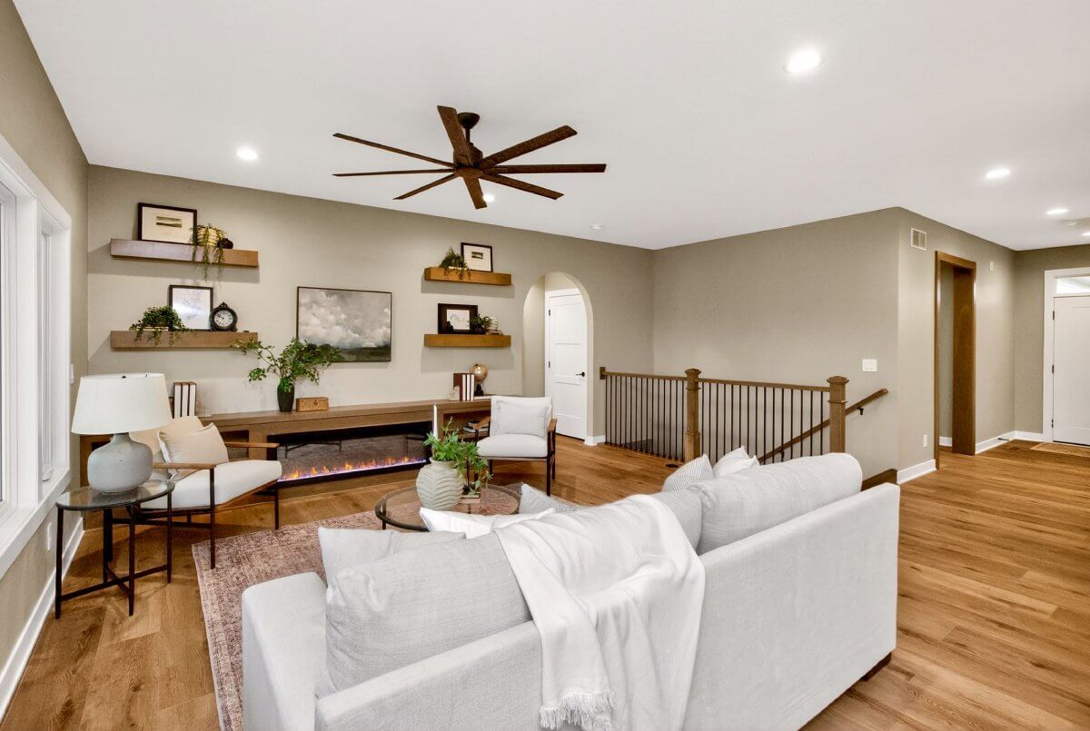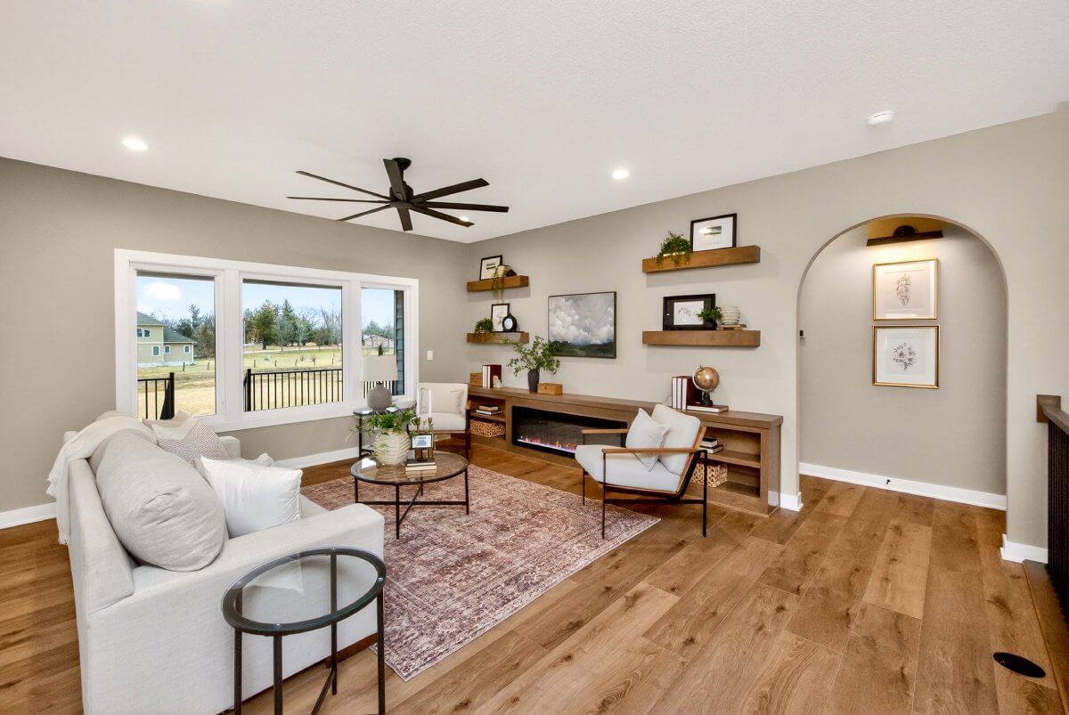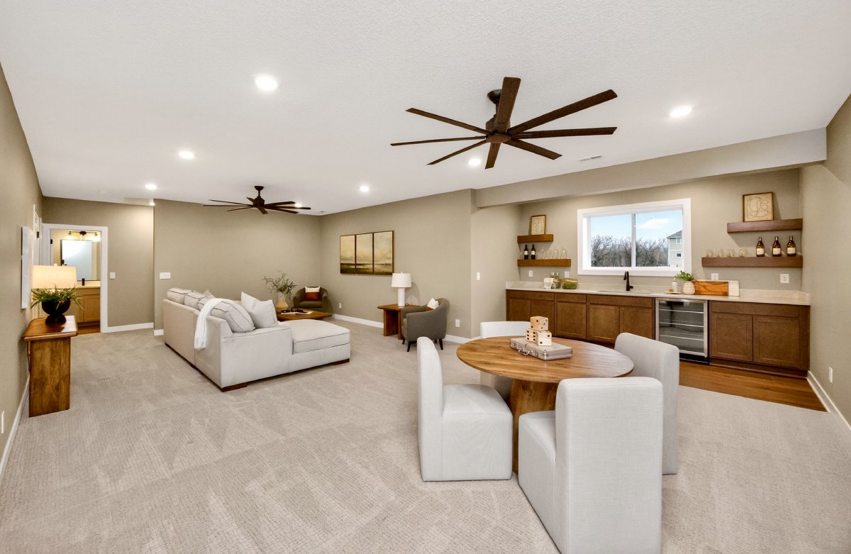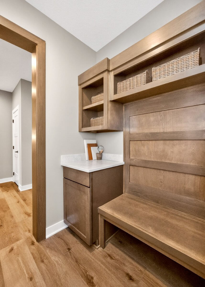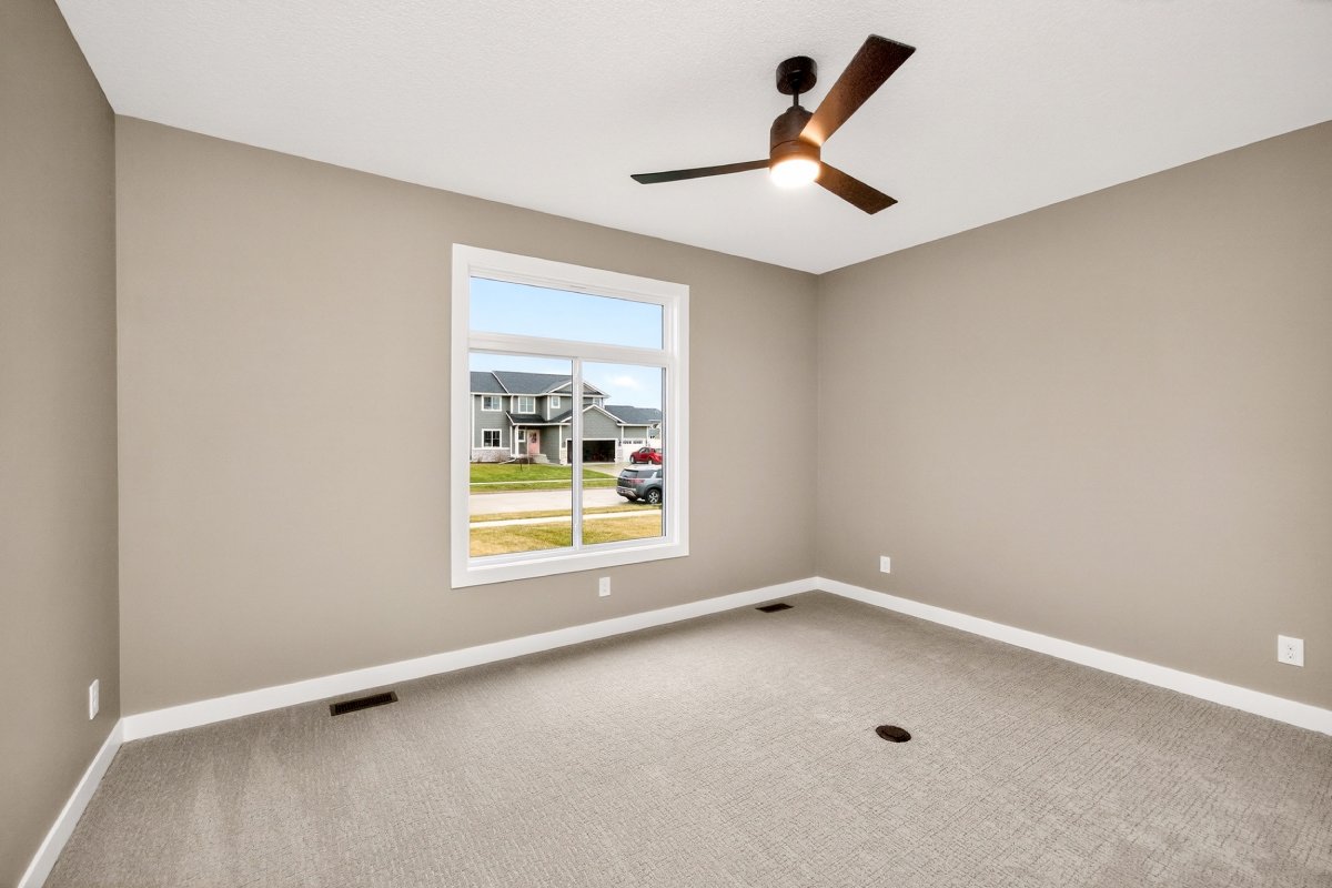 VanDerKamp Home Builders’ Stillwater Ranch Plan features 5 bedrooms (3 main level, 2 lower level) and an open floor plan featuring a maintenance-free covered deck, great room with custom built-ins, floating shelves and electric fireplace, laundry room with folding counter and sink off garage entry with access to primary bedroom, closet with custom built-ins and bathroom with tiled shower, double vanity and separate toilet room. Gorgeous mocha stained cabinets in the kitchen and walk-in pantry with custom built-in shelving and coffee/beverage station. Check out the cool kitchen island countertop with the built-in and convenient mobile charging station! Lower level family room with daylight windows, wet bar, adorable reading nook with drawers, full bathroom, and 2 bedrooms. Amazing 1,152 SF 3 car garage with 16′ X 36′ third stall, 2 floor drains, gas heater, epoxied floor, roll-up door off back of third stall leading to covered patio. Additional features include a passive radon system for piece of mind and a sodded lot with irrigation. This home is perfect for entertaining and gathering with family and friends!