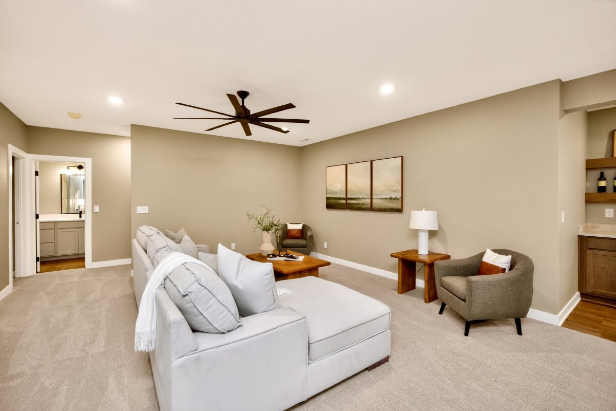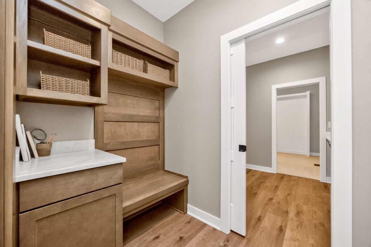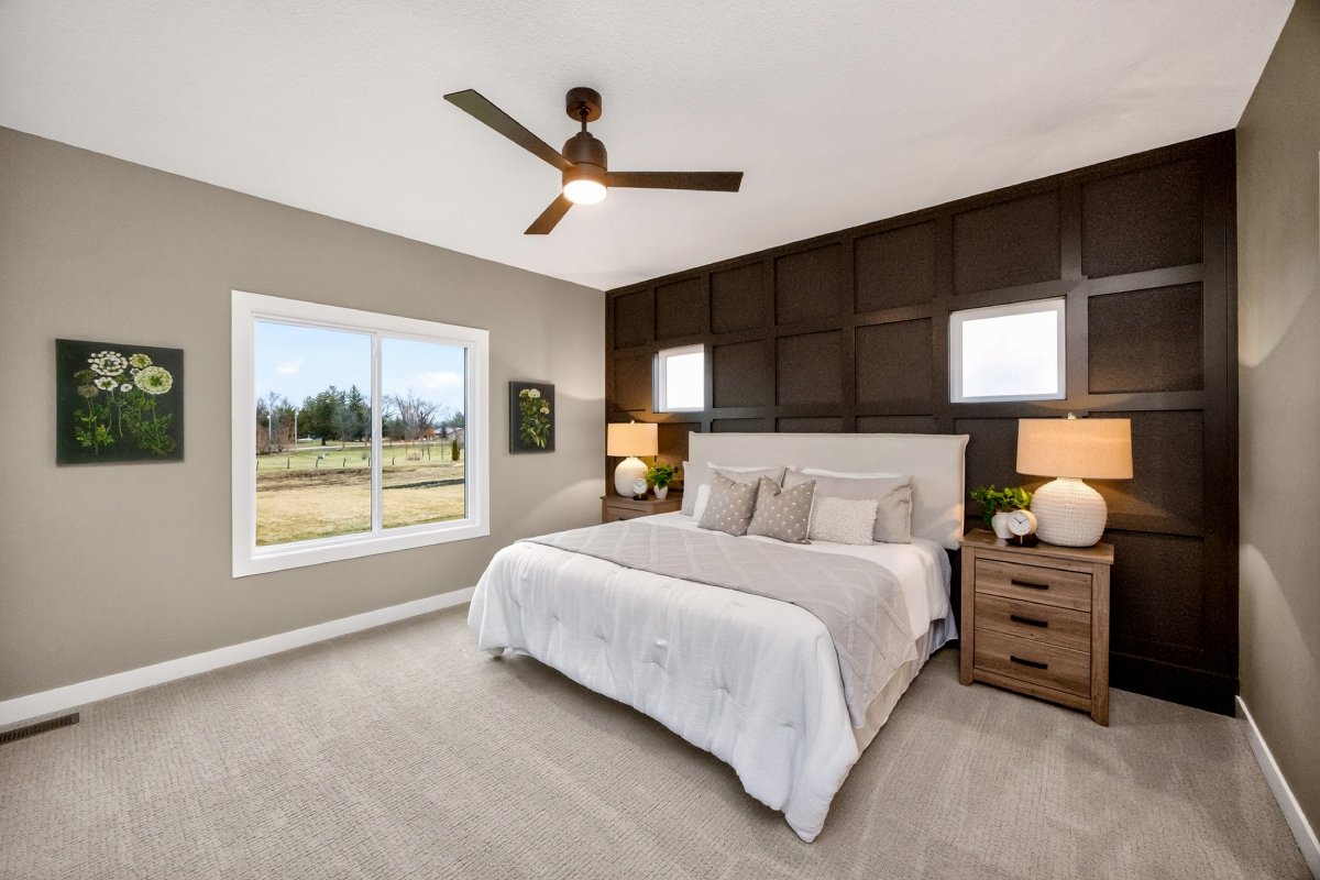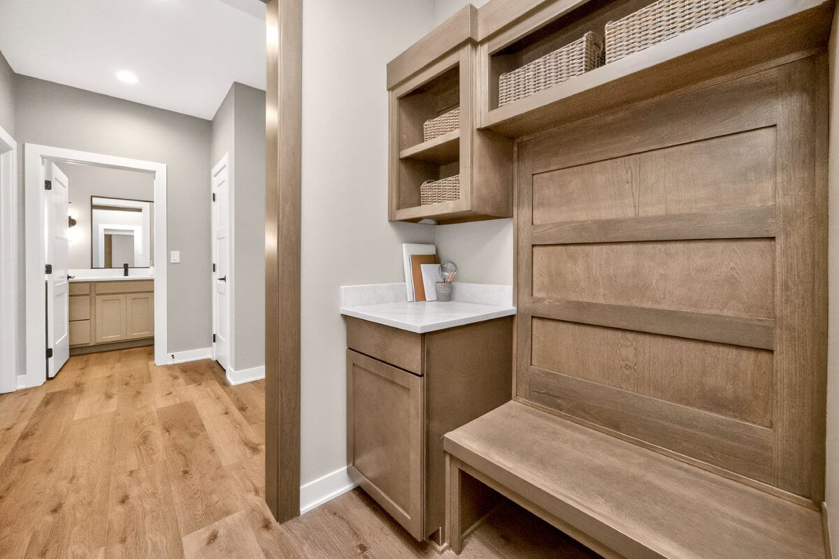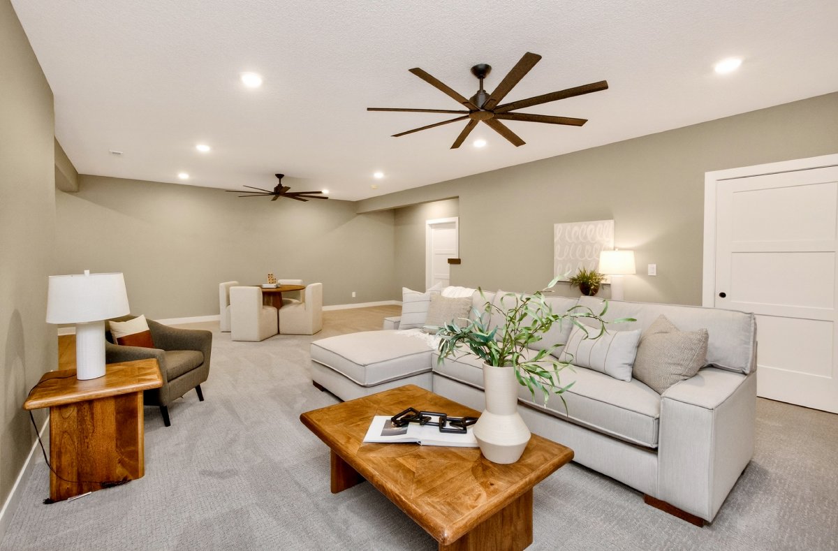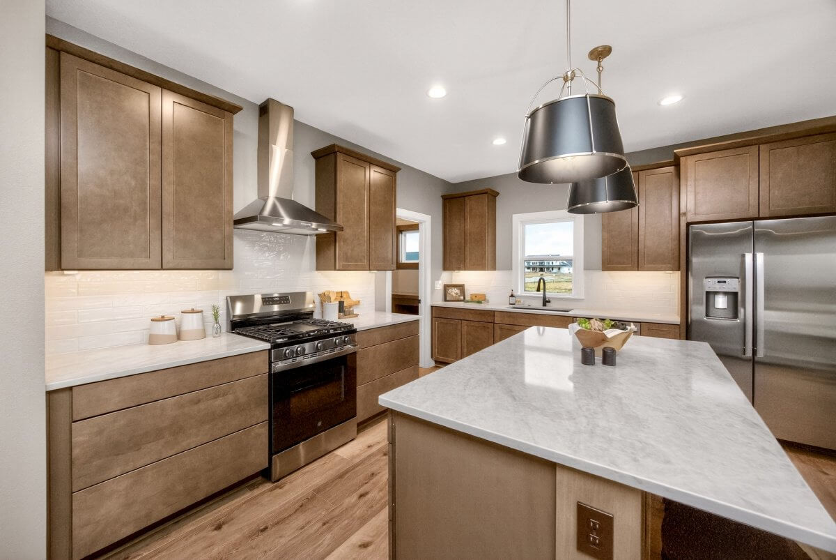 VanDerKamp Home Builders’ Stillwater Ranch Plan features 5 bedrooms (3 main level, 2 lower level) and an open floor plan featuring a maintenance-free covered deck, great room with custom built-ins, floating shelves and electric fireplace, laundry room with folding counter and sink off garage entry with access to primary bedroom, closet with custom built-ins and bathroom with tiled shower, double vanity and separate toilet room. Gorgeous mocha stained cabinets in the kitchen and walk-in pantry with custom built-in shelving and coffee/beverage station. Check out the cool kitchen island countertop with the built-in and convenient mobile charging station! Lower level family room with daylight windows, wet bar, adorable reading nook with drawers, full bathroom, and 2 bedrooms. Amazing 1,152 SF 3 car garage with 16′ X 36′ third stall, 2 floor drains, gas heater, epoxied floor, roll-up door off back of third stall leading to covered patio. Additional features include a passive radon system for piece of mind and a sodded lot with irrigation. This home is perfect for entertaining and gathering with family and friends!