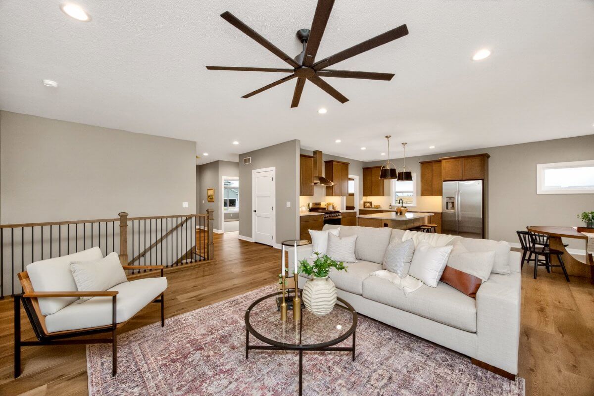 VanDerKamp Home Builders popular River Falls Ranch plan w/ 4 bedrooms, 3 bathrooms, pantry & covered deck. Open floor plan w/ great functionality, 2 BRs on main level & lots of natural lighting. Spacious kitchen w/ soft-close light grey painted cabinets with stained island, pantry w/ adjustable shelving/countertop, quartz countertops, under-cabinet lighting & luxury vinyl floors for easy maintenance. Dining area w/ door to 12′ X 12′ maintenance-free covered deck, great room w/ large windows, & electric fireplace w/ floating shelves. Primary bathroom w/ tiled shower, linen closet, double vanity, toilet room & spacious closet. Primary bathroom leads to laundry room w/ folding counter & drop zone off 3 car garage entry. Lower level features a family room with gas fireplace, 2 BRs & 3/4 bathroom w/ stained cabinets. Large garage w/ 24′ X 24′ main stall & 14′ X 36′ third stall. Fully sodded yard, plumbed for irrigation, & passive radon system. All photos are “Similar to Photo.”