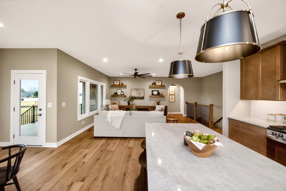 VanDerKamp Home Builder’s NEWEST ranch plan, the Lexington. This amazing new plan features 2 bedrooms up, 2 bedrooms down, 9′ ceilings throughout plus a covered deck with a view of the pond! Spacious kitchen features oyster (light gray) painted cabinets, quartz countertops, large walk-in corner pantry, 8′ island & luxury vinyl floors for easy maintenance. The kitchen overlooks a great room w/ electric fireplace w/ built-ins, large windows and dining area with slider to covered deck w/ stairs. The master bedroom leads to the bathroom w/ a double vanity, tiled shower & spacious master closet. Master closet leads directly to the laundry room off the garage entry and drop zone. Lower level features a large family room, 2 bedrooms & full bathroom. 920 SF 3 car garage, passive radon, pre-plumbed for irrigation.